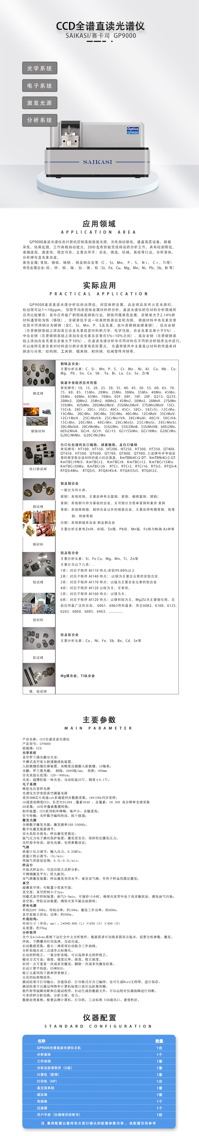 GP9000直读直读光谱分析仪检出限低。对固体的金属、合金样品采用火花光源时检出限可达1~10ppm,仅限于均质固体金属材料的分析。直读光谱仪的在材料分析领域的应用比较繁杂:其中应用广的领域是钢铁行业,钢铁同属黑色金属。含碳量大于2.14%的材料通常称为铁 (铸铁),含碳量低于这一标准的铁基合金称为钢。 根据材料中各元素含量范围不同将钢分为碳钢 (含C、Si、Mn、P、S五元素,也叫普碳钢或碳素